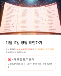 자, 그럼 모두가 기다리던 11월 11일 비트버니 퀴즈 정답을 확인할 시간이에요! 오늘 출제된 오늘의 상식 퀴즈 3문제와 코인이 쌓이는 퀴즈 1문제, 총 4개 정답이 모두 궁금하시죠? 아래 버튼을 클릭하면 모든 정답을 한 번에 확인할 수 있어요!