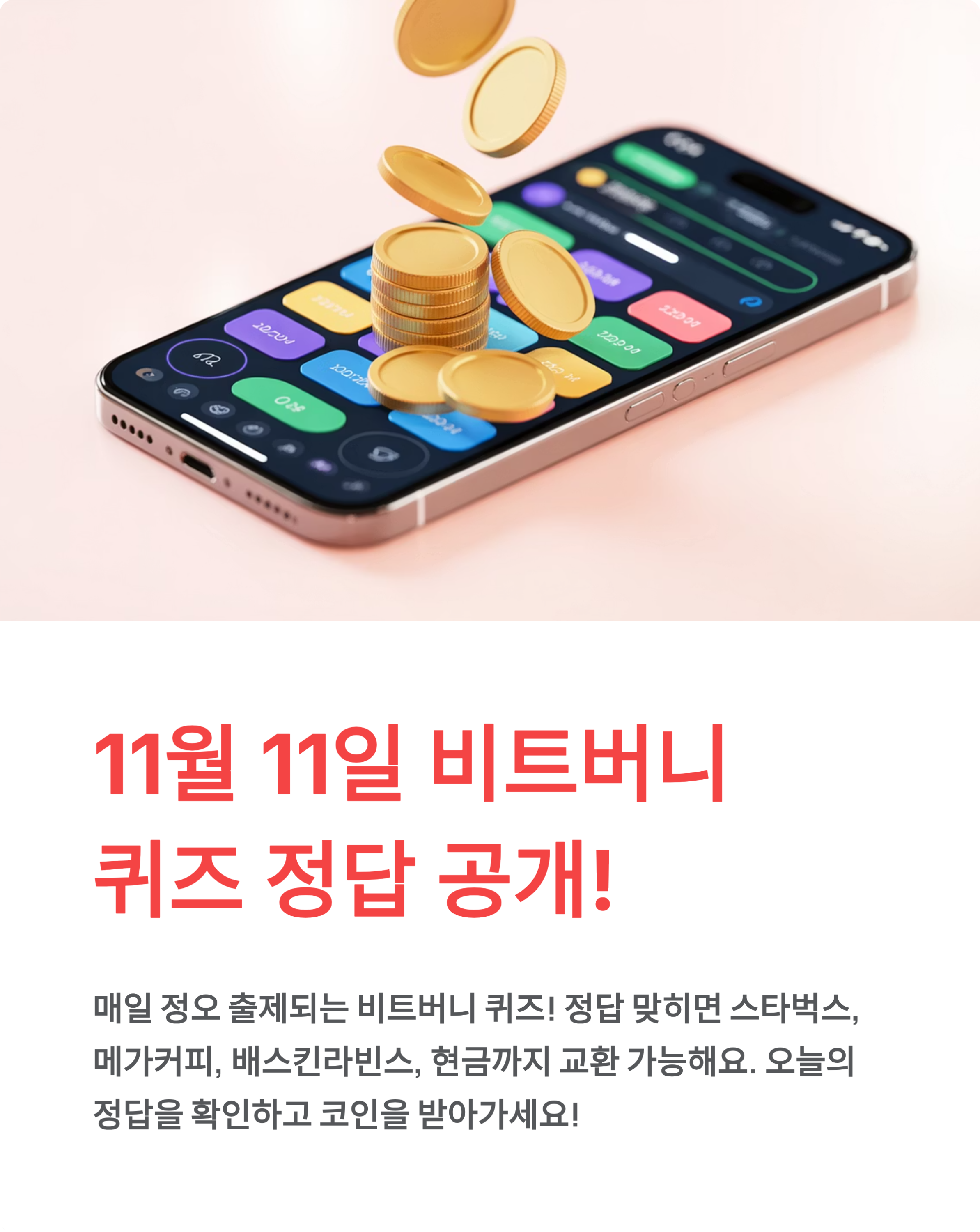 매일 정오에 출제되는 비트버니 오늘의 상식 퀴즈! 11월 11일 오늘도 퀴즈를 풀면 코인을 받을 수 있는데요. 정답을 맞히면 스타벅스, 메가커피, 배스킨라빈스, 심지어 현금까지 교환할 수 있어요. 과연 오늘의 정답은 무엇일까요?