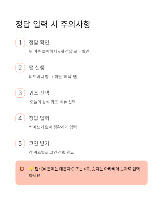 정답 버튼을 클릭하셨나요? 4개 퀴즈의 모든 정답이 자세히 나와 있을 거예요! 오늘의 상식 퀴즈 3문제와 코인이 쌓이는 퀴즈 1문제의 정답을 모두 확인하실 수 있답니다. 각 문제마다 입력 방법도 안내되어 있으니 참고하세요!