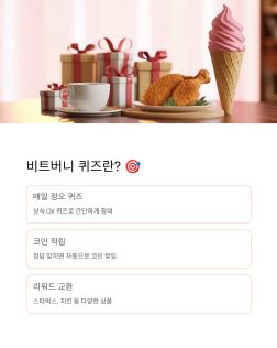 정답을 맞히면 코인이 쌓이고, 쌓인 코인으로 스타벅스, 메가커피, 치킨, 배스킨라빈스 같은 다양한 상품으로 교환할 수 있답니다 ☕🍗🍦