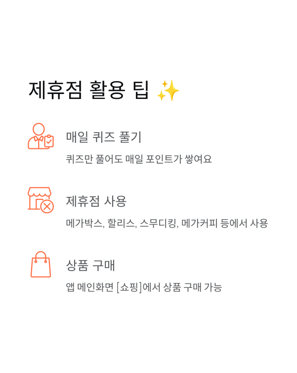 모은 포인트는 전국 40,000여 제휴점에서 현금처럼 사용할 수 있으니 매일매일 퀴즈 풀어서 용돈 버세요! 💰