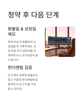 청약 마감 후 환불일과 상장일을 메모하세요. 상장 첫날 주가 급등락 피하려면 뉴스 모니터링 필수! 단기 매도 유혹에 흔들리지 말고, 기업 펀더멘털에 집중하면 더 큰 수익 날 수 있어요.