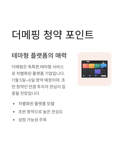 11월 공모주는 초반에 몰려 있어요. 기술·플랫폼 기업들이 주를 이루면서 투자자들의 시선이 쏠리고 있죠. 더메핑의 테마형 매력, 이노테리의 반도체 성장성, 큐리오시스의 AI 잠재력이 포인트예요. 시장 분위기는 안정적이라 청약 경쟁률도 높을 전망!