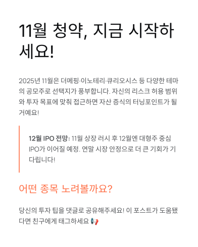 11월 청약 중 어떤 종목 노려볼까요? 당신의 투자 팁 댓글로 공유해주세요! 다음엔 12월 IPO 상세 분석으로 돌아올게요~