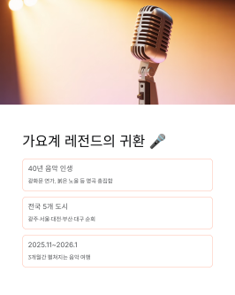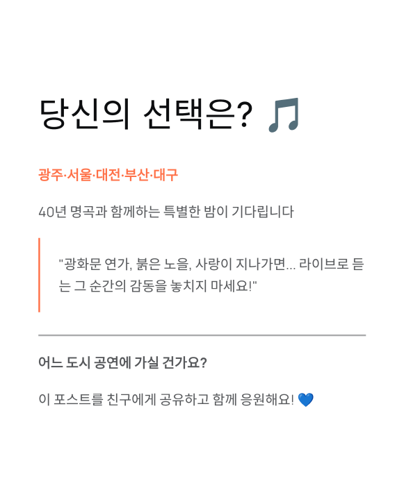 여러분은 어느 도시 공연에 가실 계획이신가요? 댓글로 공유해주시면 함께 응원해요! 다음 글에서는 '이문세 명곡 베스트 10'으로 찾아올게요. 콘서트 가기 전에 미리 들어두면 좋을 노래들을 소개해드릴게요! 🎵