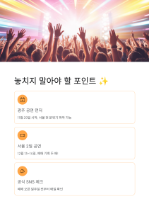 광주 공연이 가장 먼저 시작되니까 서울 공연 전에 분위기를 미리 파악할 수 있는 장점이 있어요. 서울은 이틀 연속 공연이라서 예매 기회가 두 배랍니다!