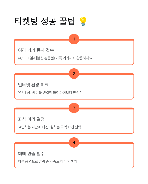 4. 예매 연습: 예매 오픈 전에 다른 공연으로 미리 연습해보는 것도 도움이 돼요. 클릭 순서와 속도를 익혀두면 실전에서 당황하지 않아요!
