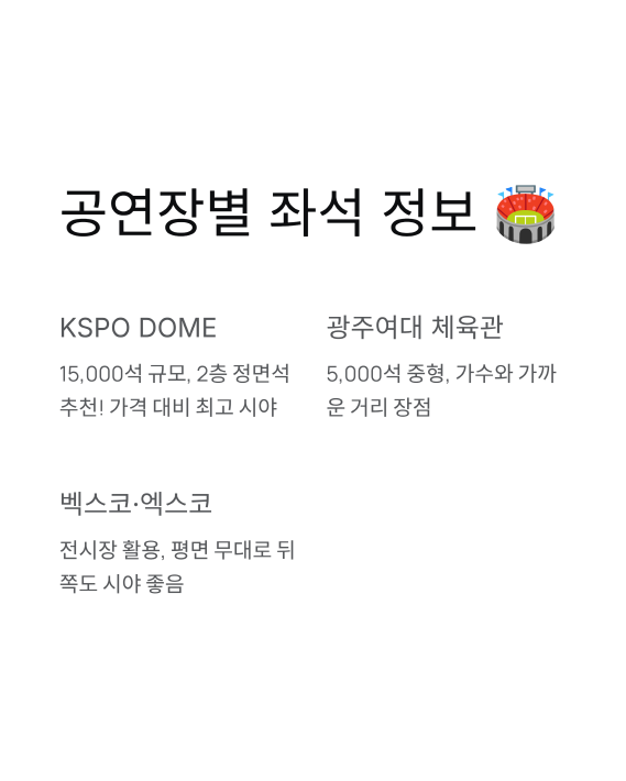 벡스코, 엑스코 (부산, 대구): 전시장을 공연장으로 활용하는 경우인데, 평면 무대로 진행될 가능성이 높아요. 앞쪽 좌석이 당연히 유리하죠.