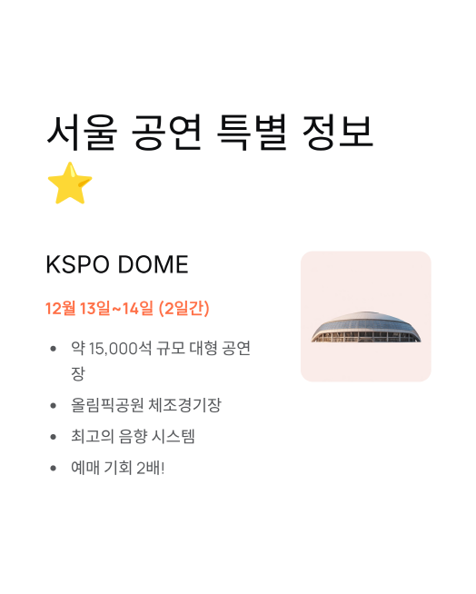 KSPO DOME (서울): 올림픽공원 체조경기장은 약 15,000석 규모예요. 1층은 스탠딩이나 이동석, 2층은 고정석으로 구성되는 경우가 많아요. 음향이 정말 좋은 공연장이에요.