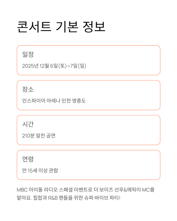 안녕하세요, K-팝 콘서트 매니아 블로거예요! MBC 아이돌 라디오의 스페셜 이벤트로, 더 보이즈 선우&에릭이 MC 맡은 이 콘서트는 힙합과 R&B 팬들을 위한 슈퍼 바이브 파티예요.