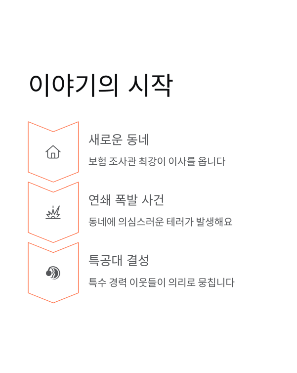 보험 조사관 최강(윤계상 분)이 이사 온 동네에 연쇄 테러가 의심되는 폭발 사건이 일어나요. 다양한 특수 경력을 지닌 이웃들은 의리로 뭉쳐 특공대 작전에 돌입하게 된답니다!